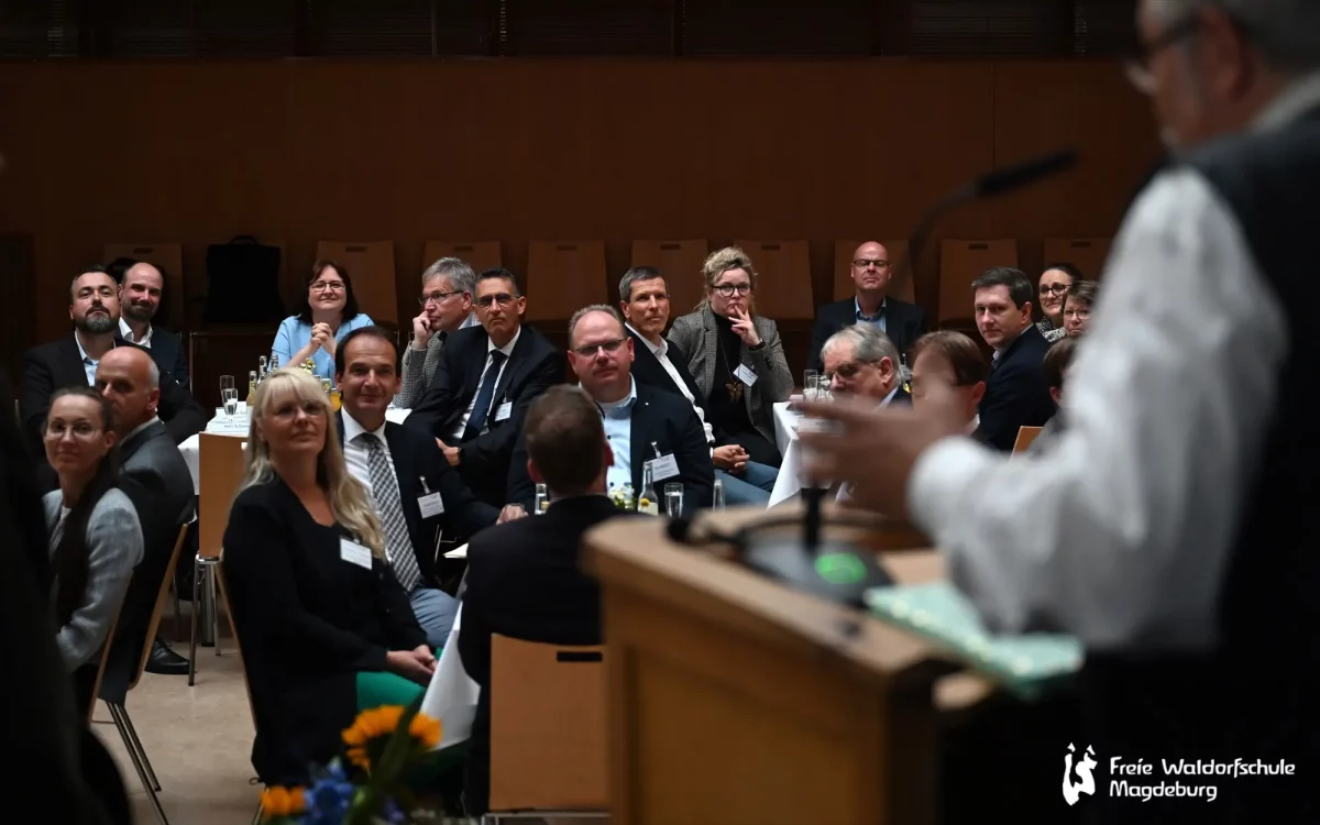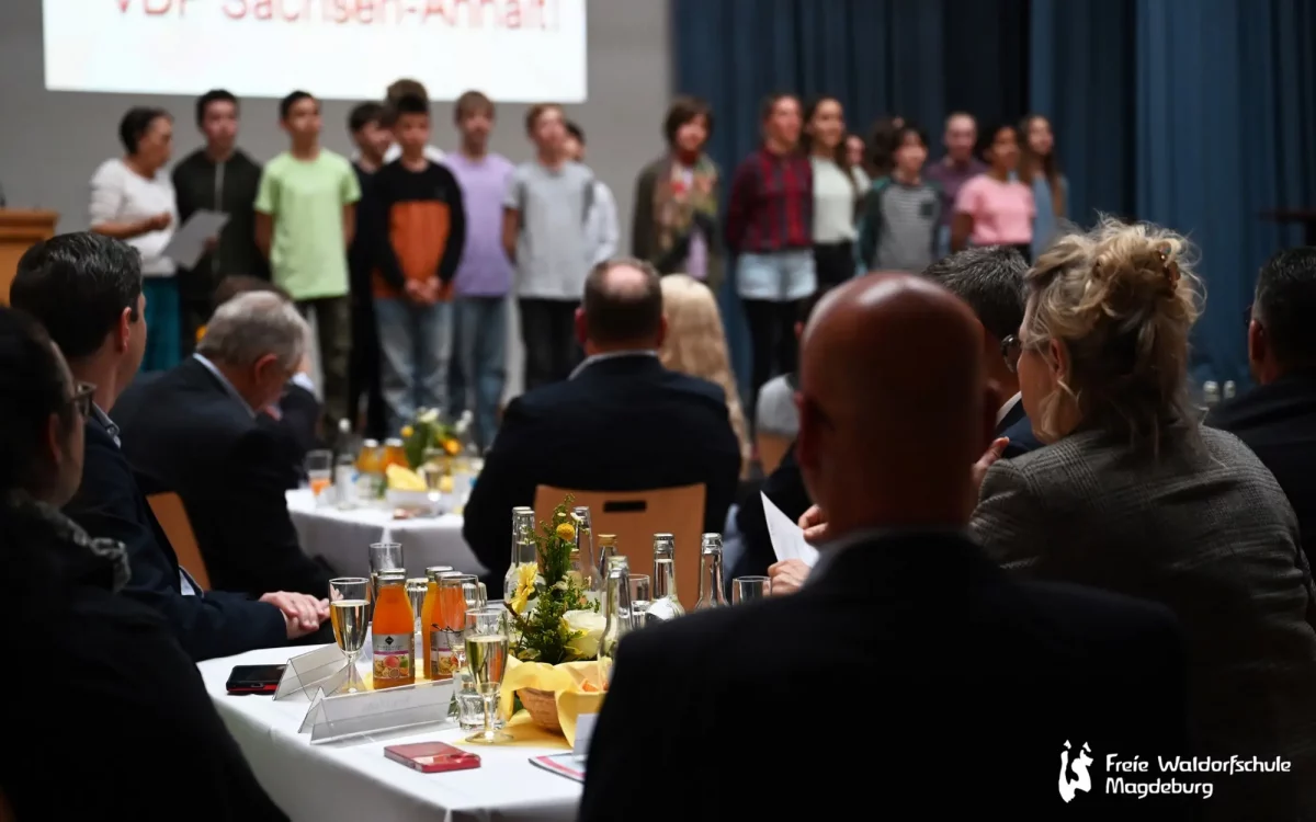 Zu Gast war dieses Mal die FDP-Fraktion Sachsen-Anhalt. Nach der Eröffnung des Parlamentarischen Abends durch Katrin Hochheiser (Vorsitzende VDP Sachsen-Anhalt) und Christward Buchholz (Geschäftsführer Freie Waldorfschule Magdeburg/Thale) begrüßte auch unsere Klasse 6B die Gäste mit einem dreistimmigen Chorsatz zu „Cum decore, cum decore“.