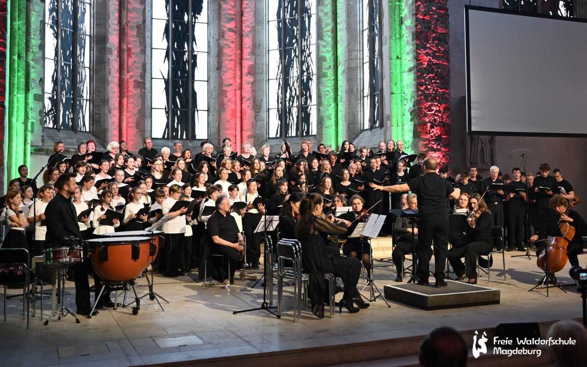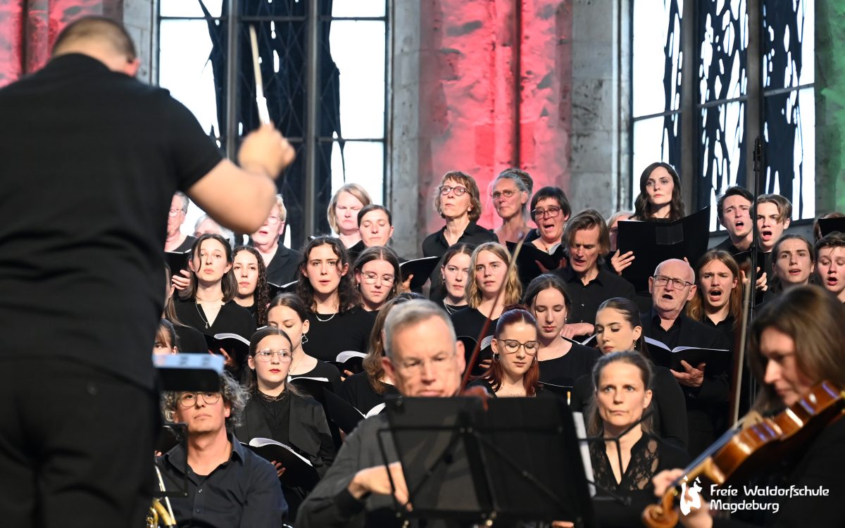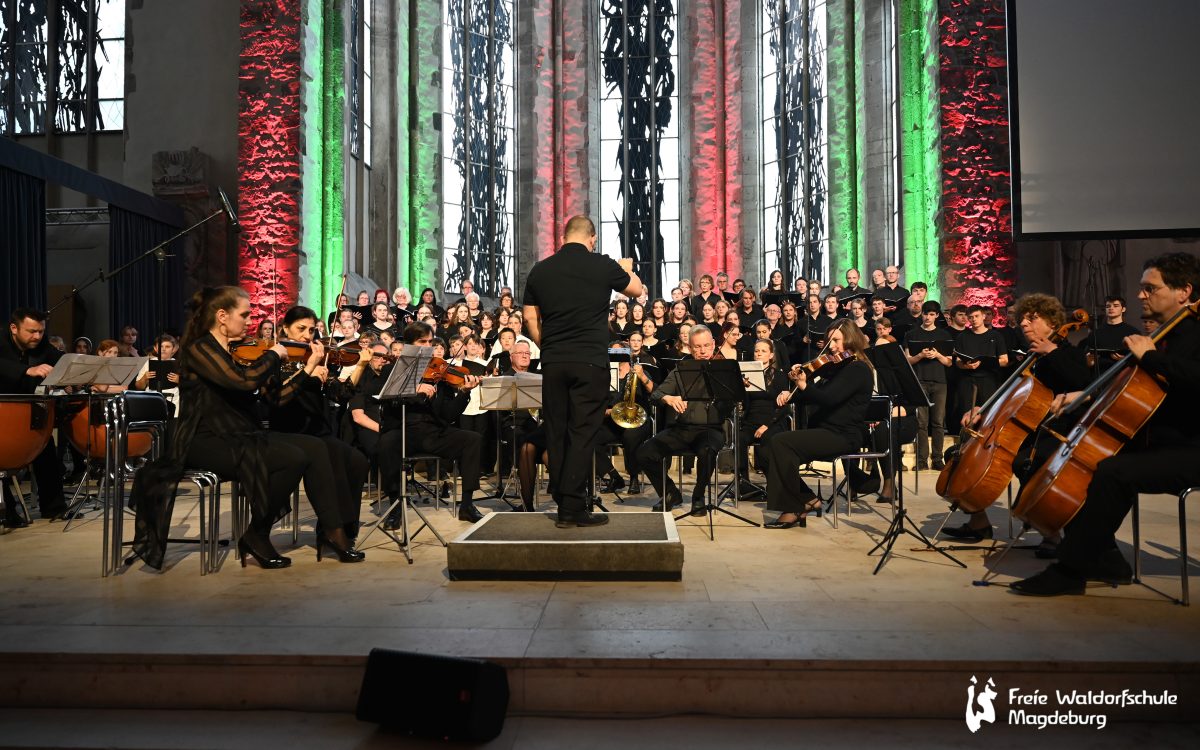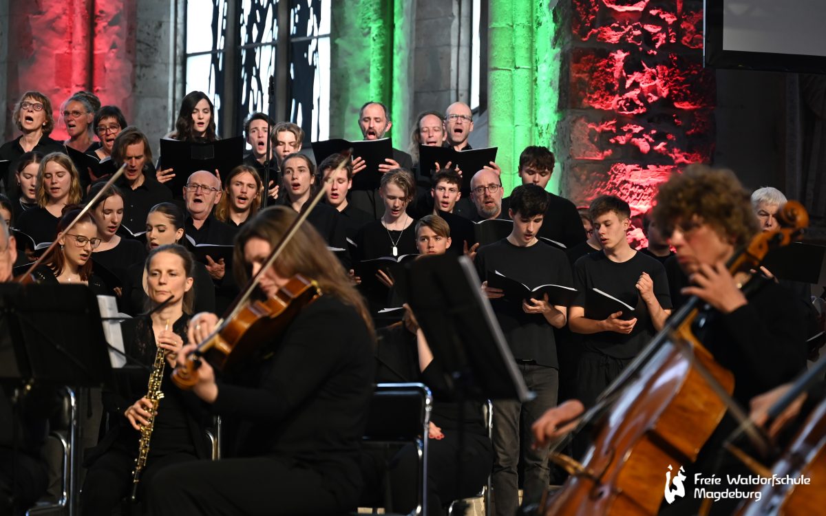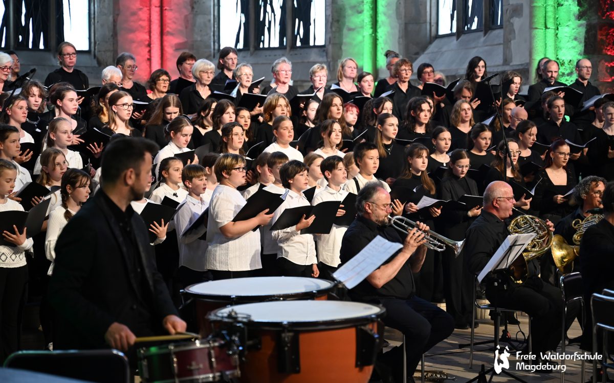 Gemeinsam mit dem „Friedensforum Johanniskirche 1631-2031“ lud die Freie Waldorfschule Magdeburg am Freitag, dem 10. Mai 2024 um 16 Uhr zur Friedensmesse „Dem Frieden in der Welt“ in die Johanniskirche Magdeburg ein. Im Rahmen des Tages des Gedenkens an die Zerstörung Magdeburgs 1631 übernahmen die Chöre der Freien Waldorfschule mit der Friedensmesse, neben der Ökumenisches Gebet und der Magdeburger Rede über den Frieden, einen Hauptprogrammpunkt. Auch Oberbürgermeisterin Simone Borris ließ es sich nicht nehmen, die Friedensmesse mit einem Grußwort zu eröffnen.