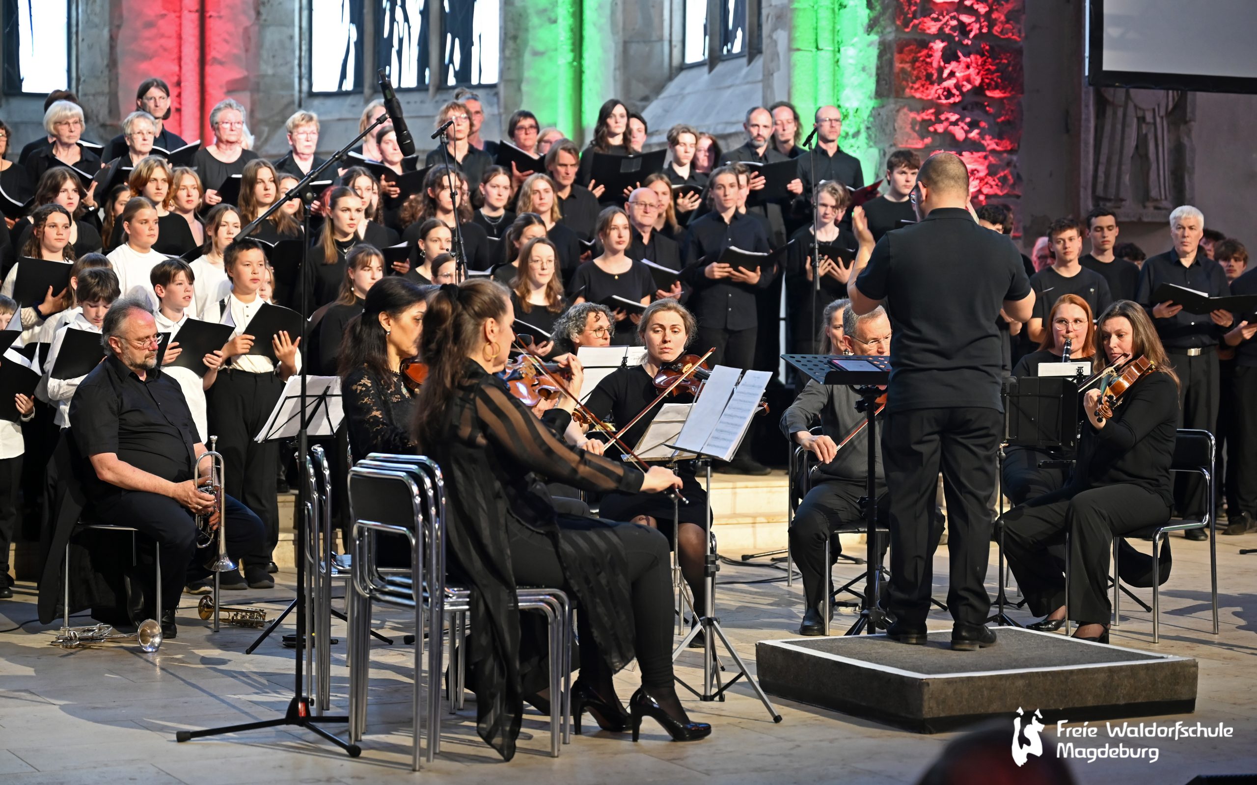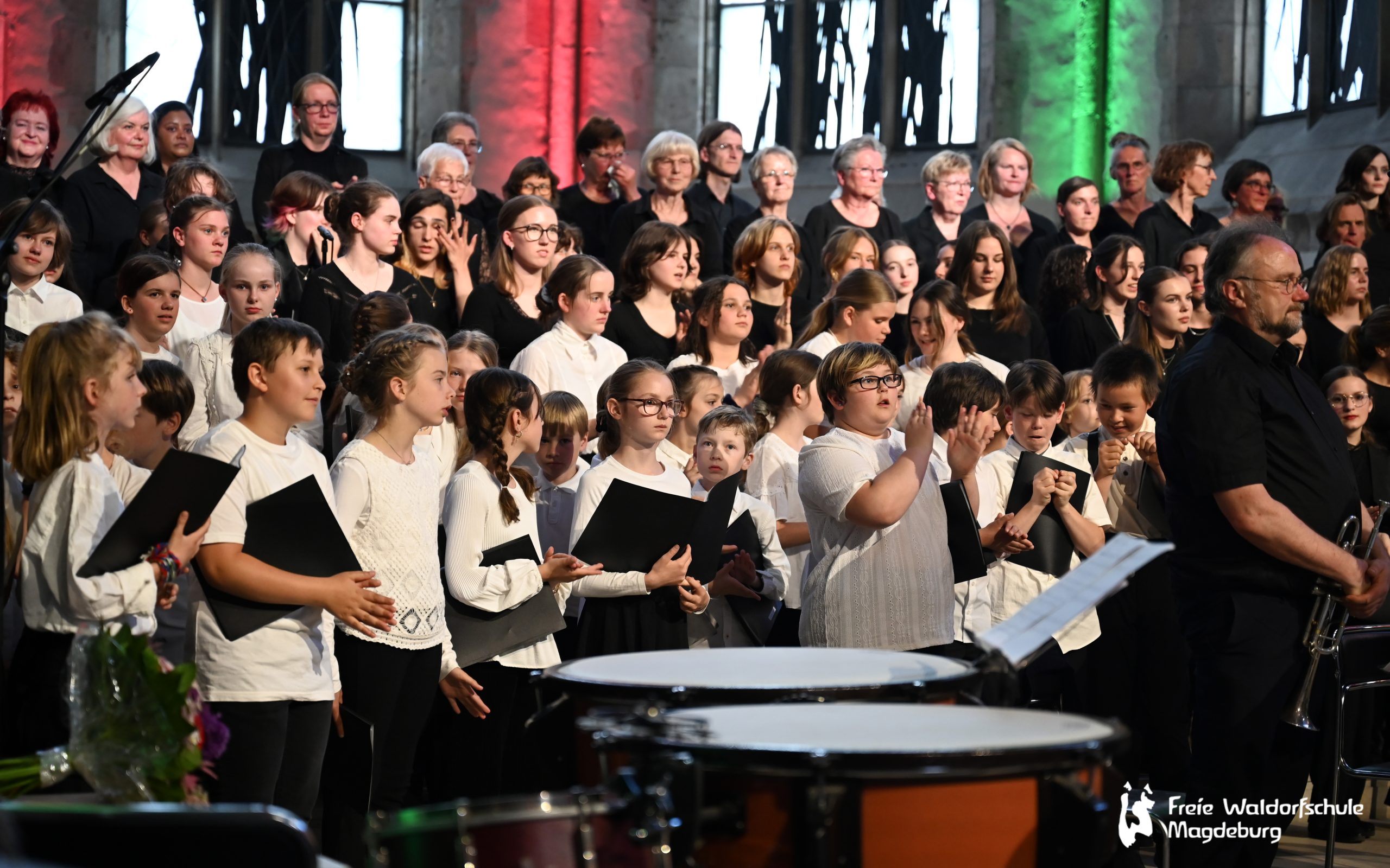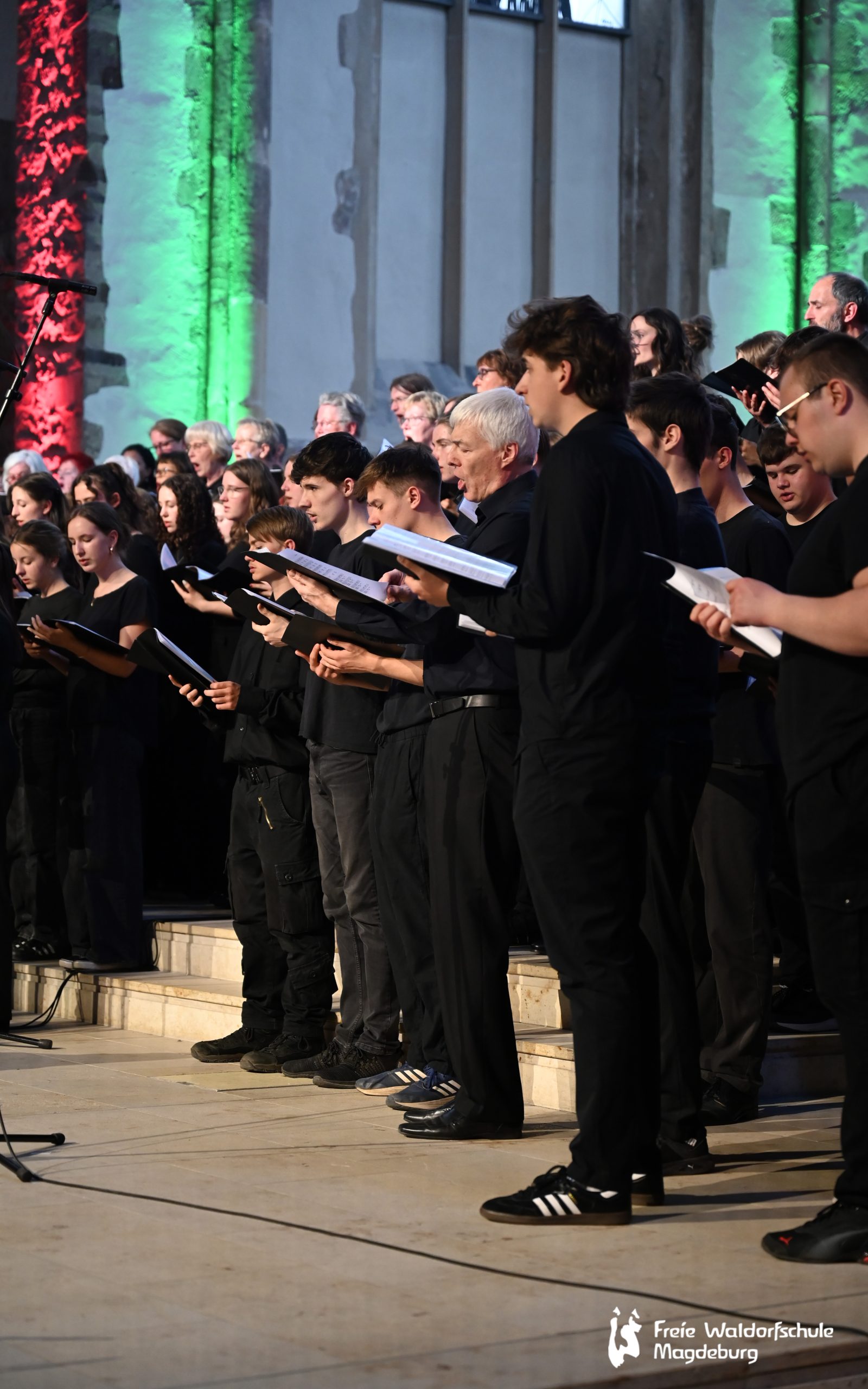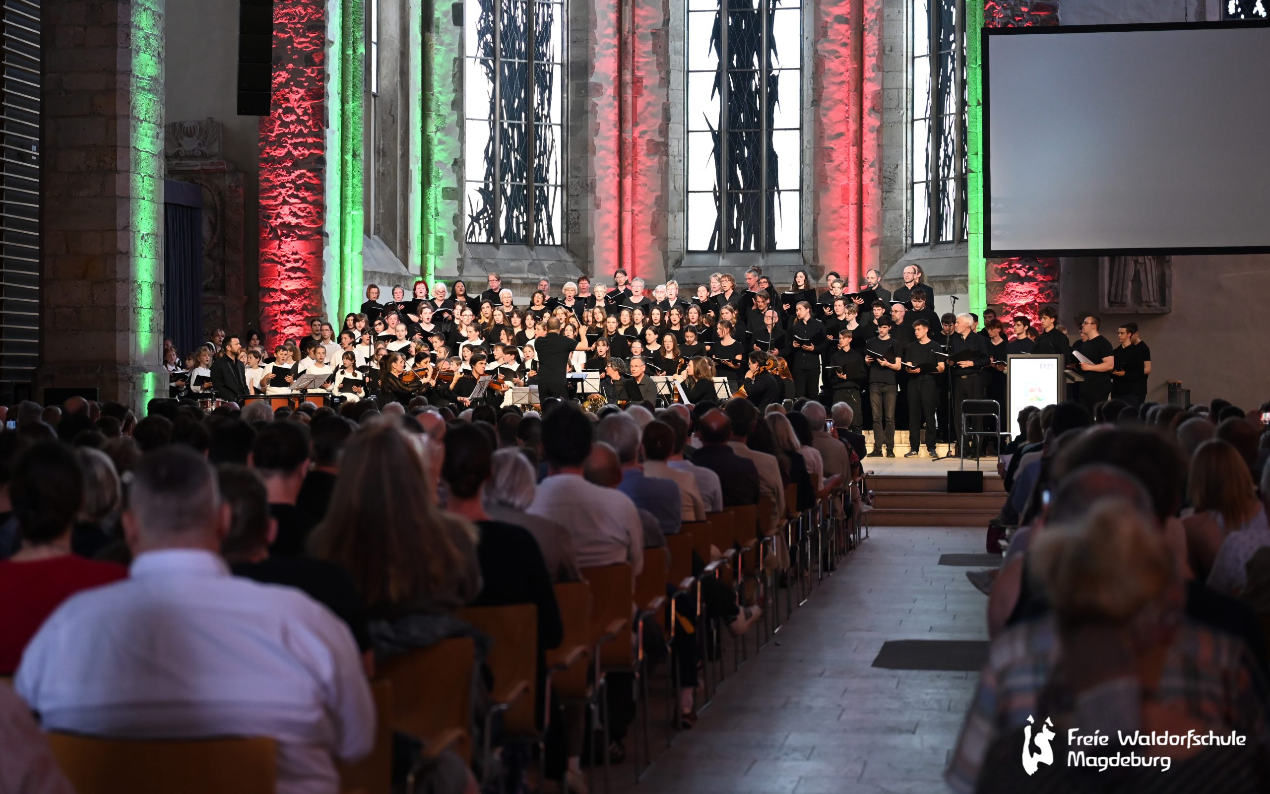 Gemeinsam mit dem „Friedensforum Johanniskirche 1631-2031“ lud die Freie Waldorfschule Magdeburg am Freitag, dem 10. Mai 2024 um 16 Uhr zur Friedensmesse „Dem Frieden in der Welt“ in die Johanniskirche Magdeburg ein. Im Rahmen des Tages des Gedenkens an die Zerstörung Magdeburgs 1631 übernahmen die Chöre der Freien Waldorfschule mit der Friedensmesse, neben der Ökumenisches Gebet und der Magdeburger Rede über den Frieden, einen Hauptprogrammpunkt. Auch Oberbürgermeisterin Simone Borris ließ es sich nicht nehmen, die Friedensmesse mit einem Grußwort zu eröffnen.
