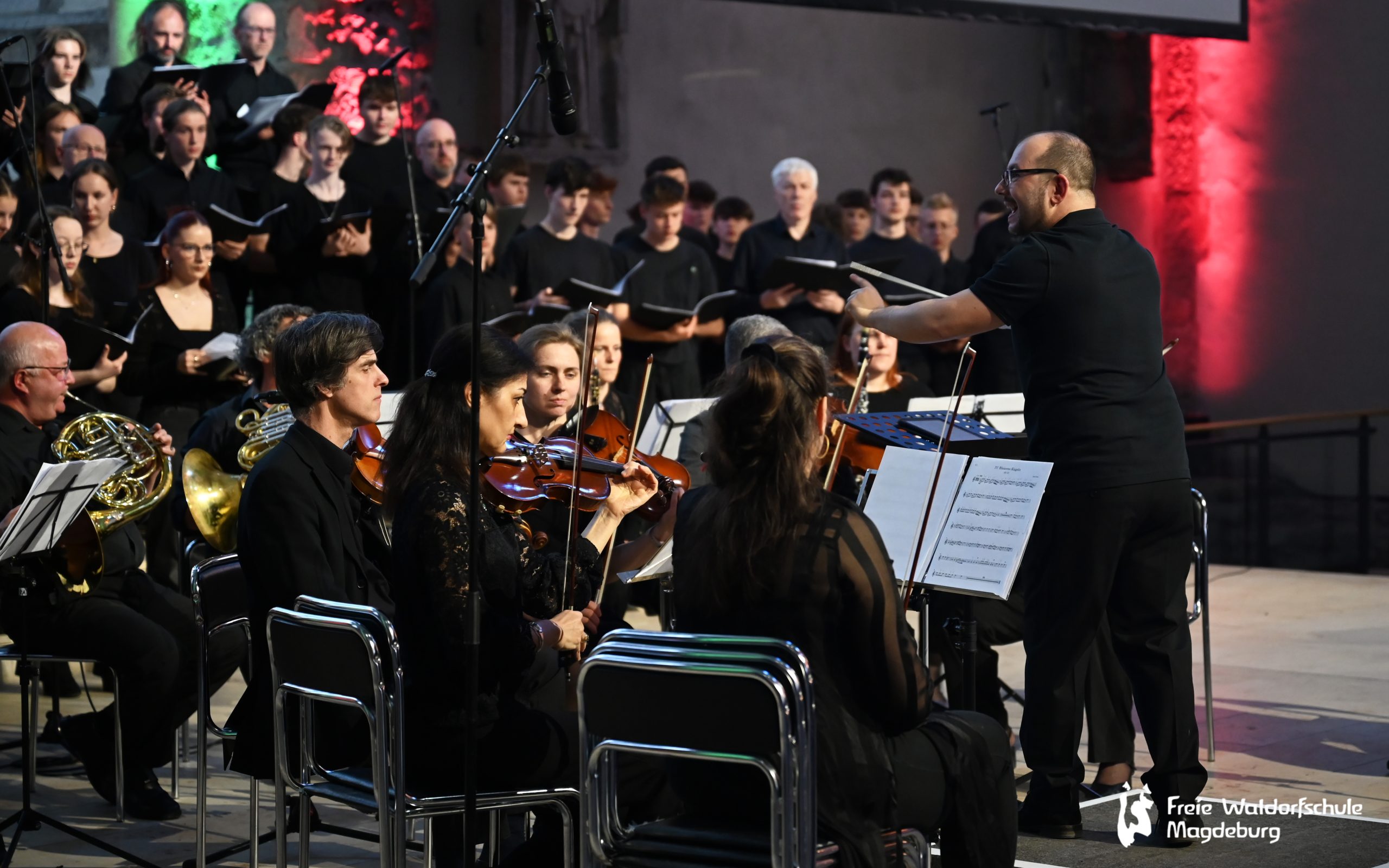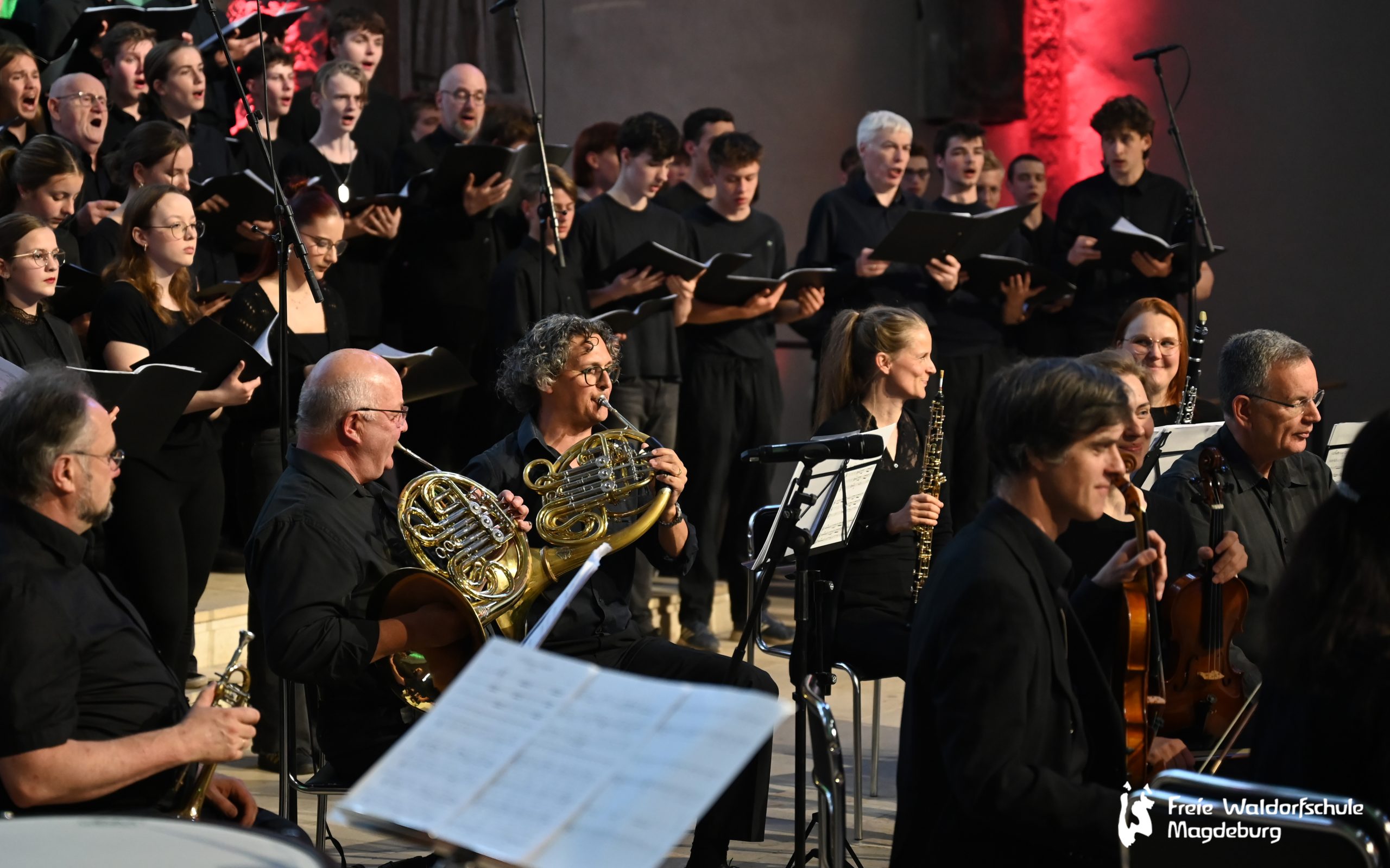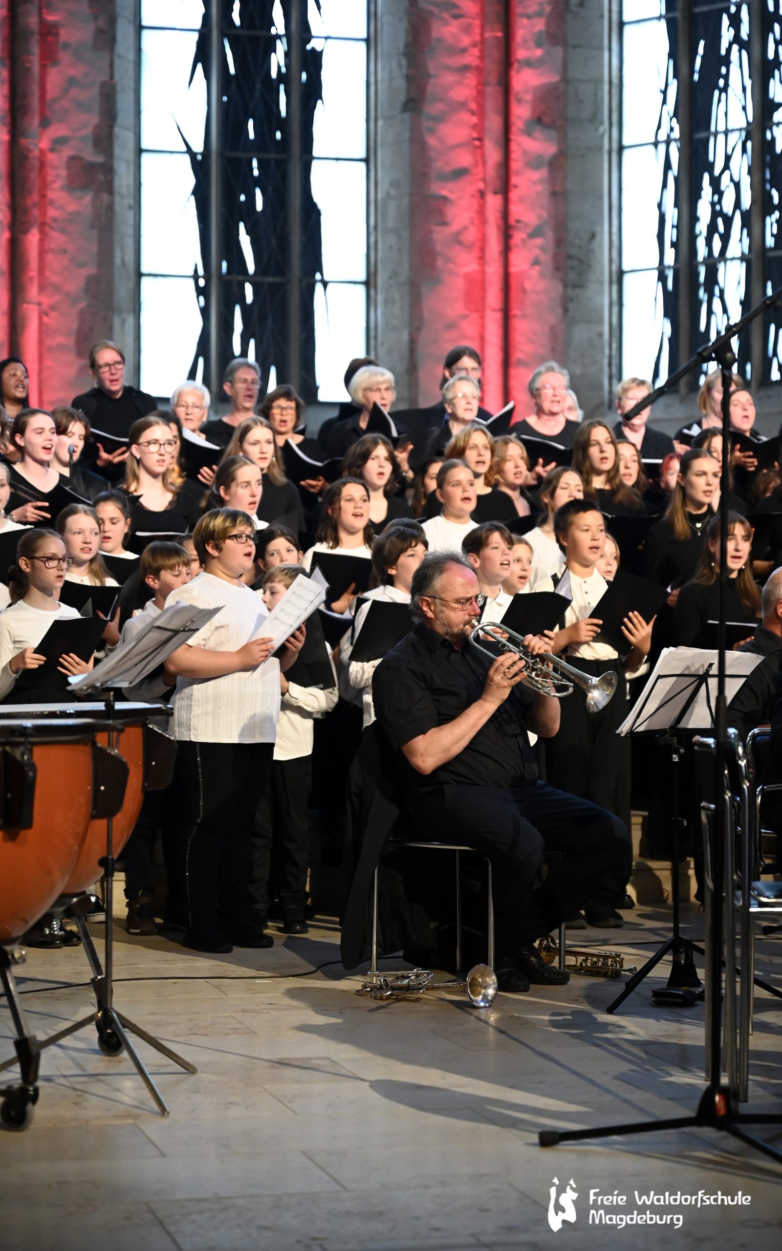 Gemeinsam mit dem „Friedensforum Johanniskirche 1631-2031“ lud die Freie Waldorfschule Magdeburg am Freitag, dem 10. Mai 2024 um 16 Uhr zur Friedensmesse „Dem Frieden in der Welt“ in die Johanniskirche Magdeburg ein. Im Rahmen des Tages des Gedenkens an die Zerstörung Magdeburgs 1631 übernahmen die Chöre der Freien Waldorfschule mit der Friedensmesse, neben der Ökumenisches Gebet und der Magdeburger Rede über den Frieden, einen Hauptprogrammpunkt. Auch Oberbürgermeisterin Simone Borris ließ es sich nicht nehmen, die Friedensmesse mit einem Grußwort zu eröffnen.
