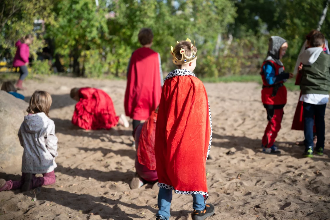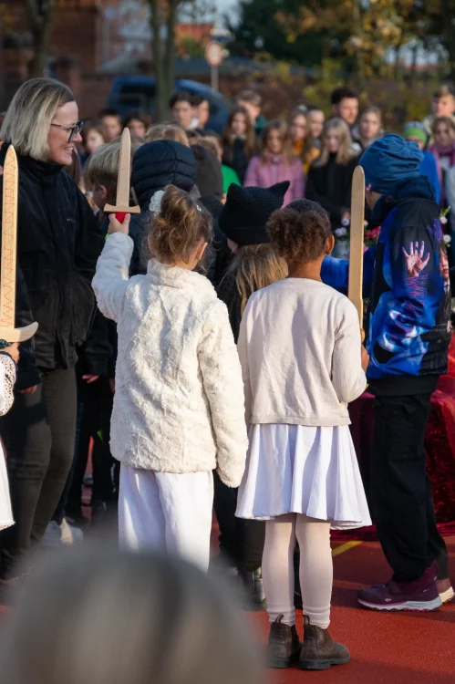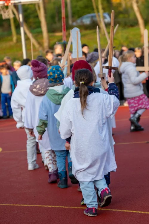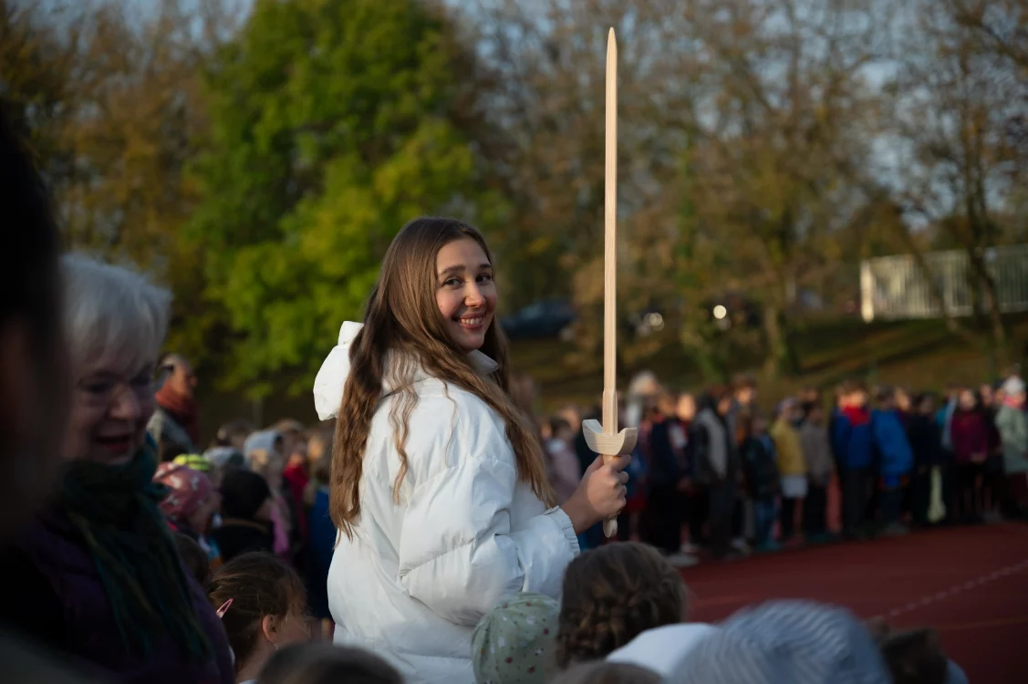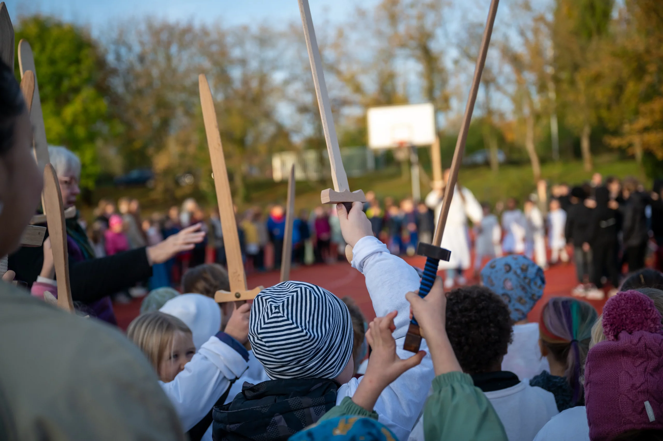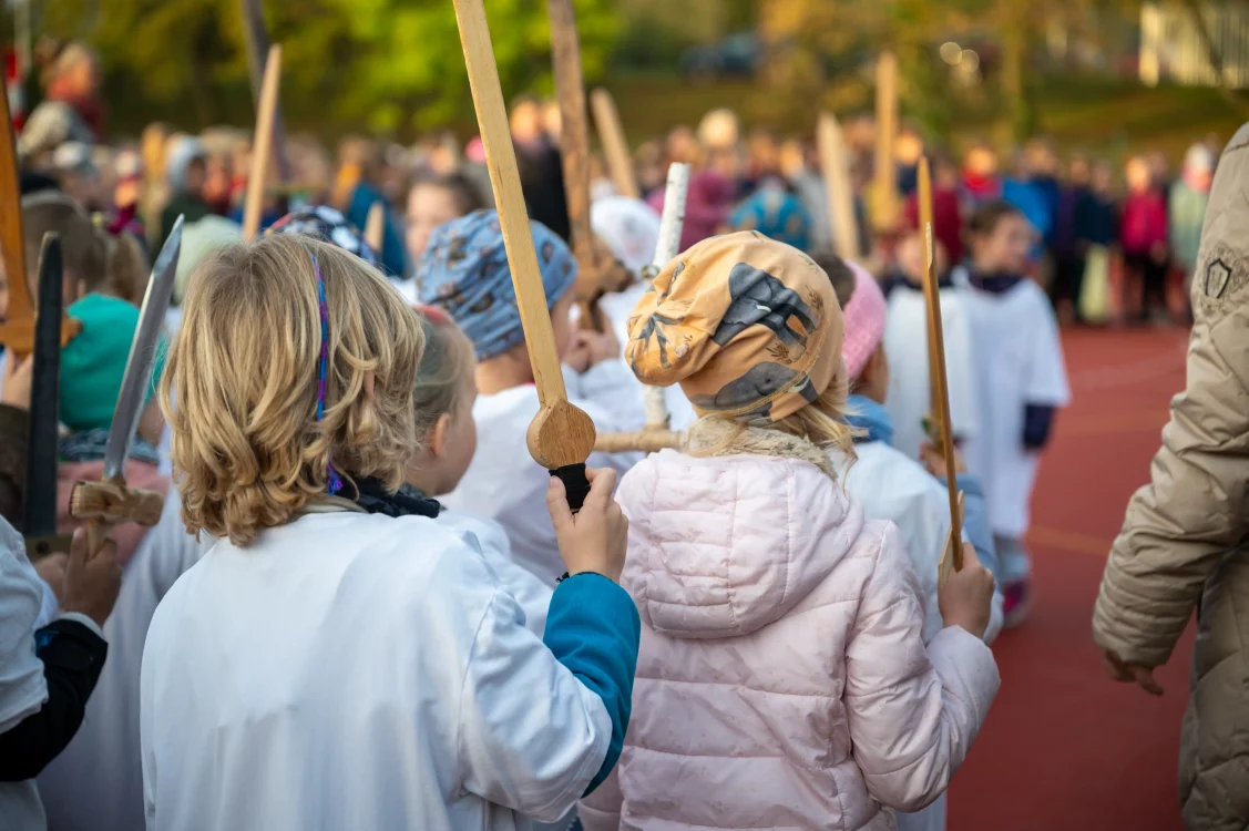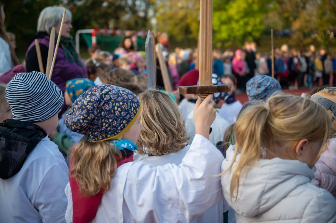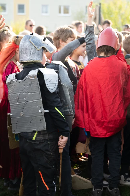 Nach einer Woche intensiver Vorbereitung und Proben feierte die Freie Waldorfschule Magdeburg am Freitag, den 18.10.24, ihr alljährliches Michaeli-Fest. Der Tag startete um 8:30 Uhr auf unserem Sportplatz mit der traditionellen Darstellung des Drachenkampfes. Anschließend konnten sich die Unterstufenschüler:innen bei einem liebevoll gedeckten Frühstück stärken. Ein herzlicher Dank geht an alle Eltern, die für das leibliche Wohl gesorgt haben! Die Aufforderung an die Schüler:innen: „Die Schwerter und Armbrüste bleiben während des Frühstücks unter dem Tisch!“ war bei diesem Anlass nicht zu vermeiden.