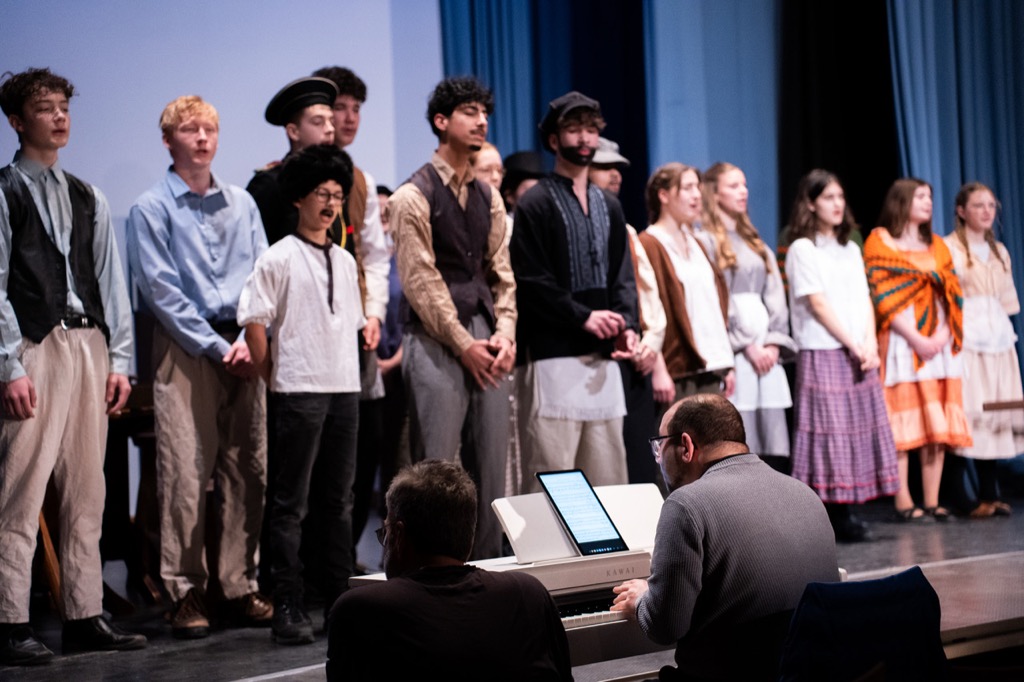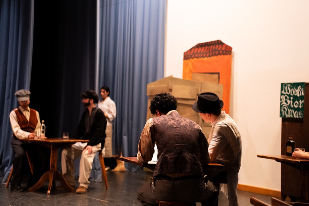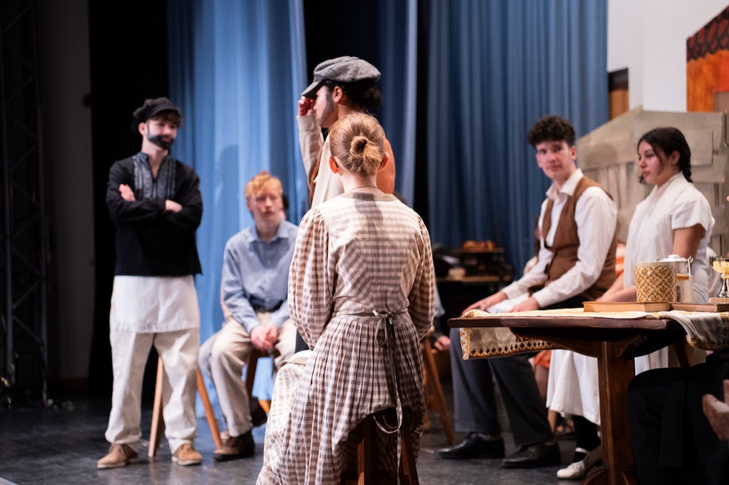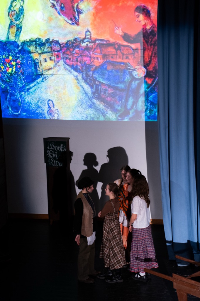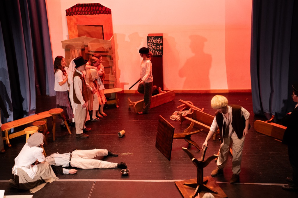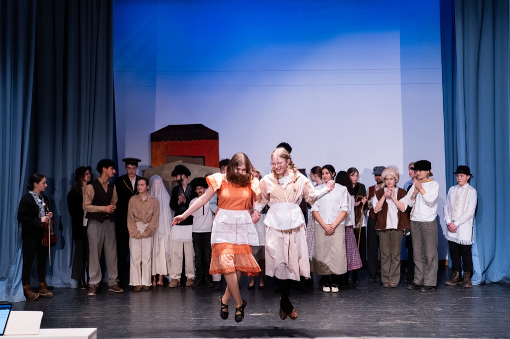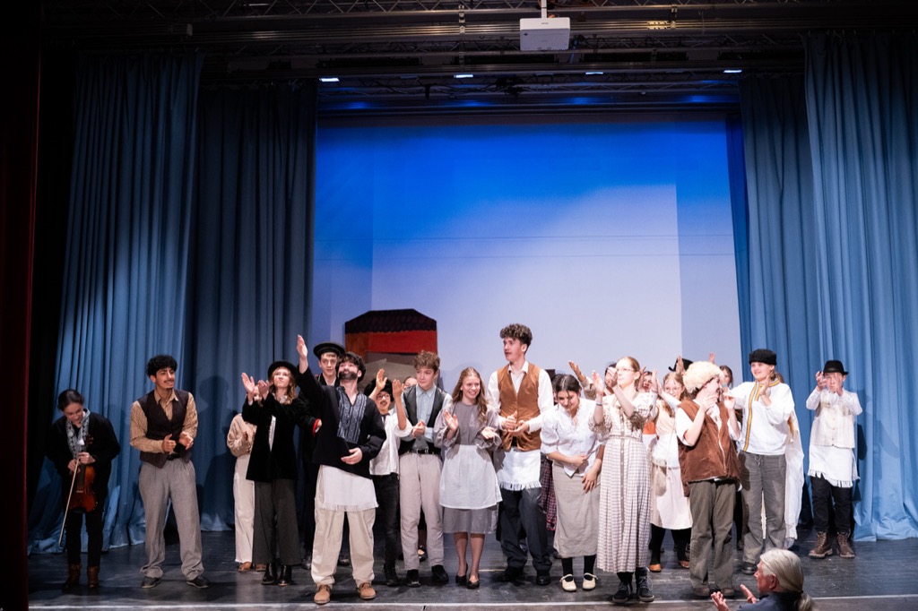 Nach vier intensiven Probenwochen war es endlich soweit: Letzten Donnerstag feierte unser Klassenspiel „Anatevka“ Premiere im Ernst-Bindel-Saal! Die Schüler:innen der 8B entführten das Publikum in das kleine Städtchen Anatevka und erzählten mit viel Herz, Humor und Gesang die Geschichte von Milchmann Tevje und seiner Familie.