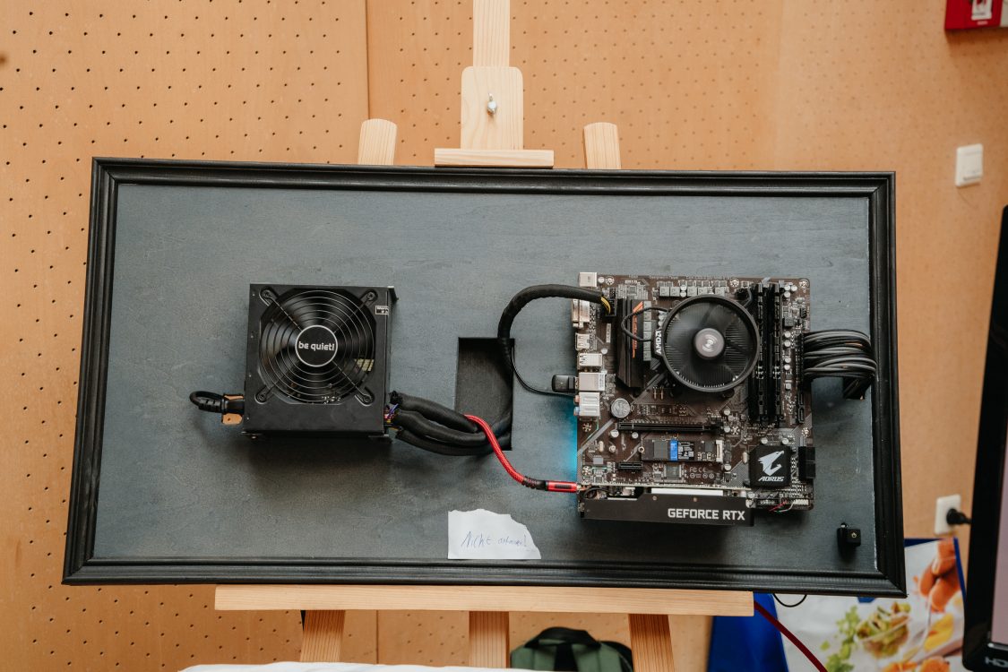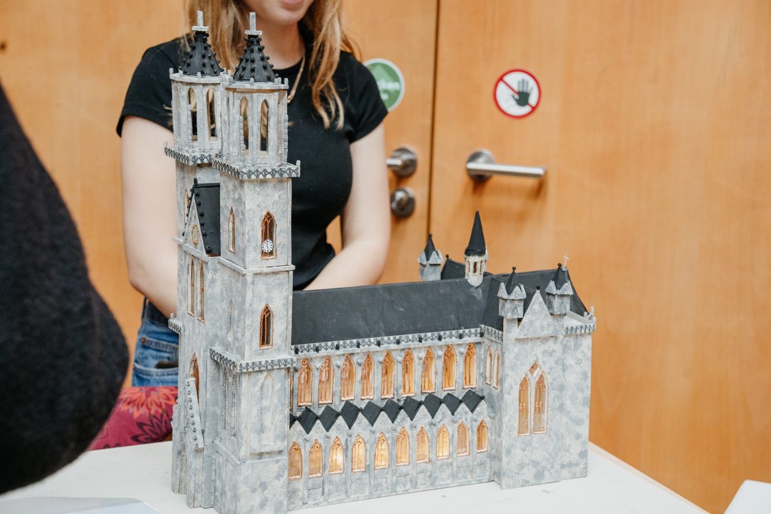 Mit dabei: ein selbstgebauter PC im Bilderrahmen, ein eigens produzierter Podcast (siehe Link unten), ein aufgenommenes Hörbuch, ein handgefertigter Wachtelverschlag sowie ein mehrere Meter langer gewebter Teppich, der von der Galerie bis fast zum Boden reichte, eine Nachbildung des Doms, ein Dokumentarfilm – und so vieles mehr.