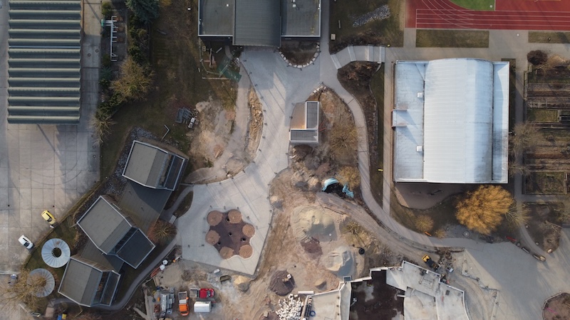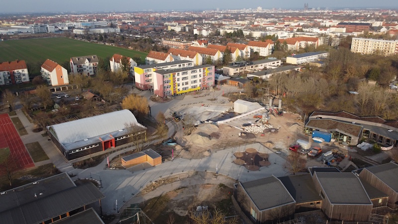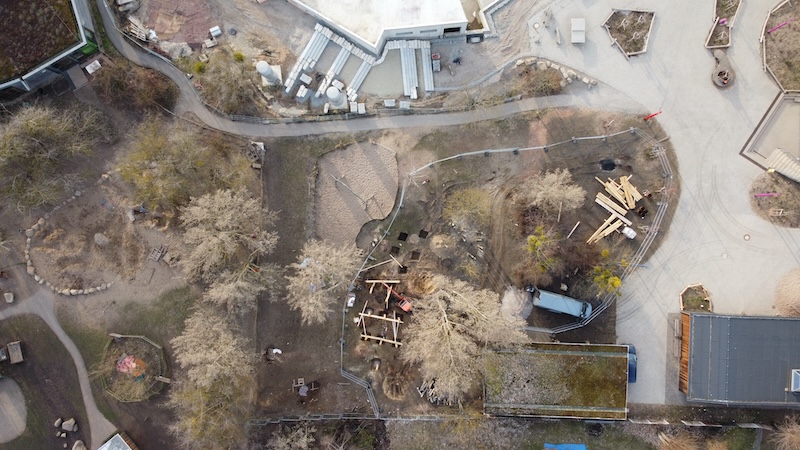 Bald beginnt der Holzbau für unseren Festsaal. Inzwischen wurde das umliegende Gelände so weit wie möglich hergerichtet, Wege angelegt, eine Kletterlandschaft und ein Hängematten-Rondell werden gebaut.